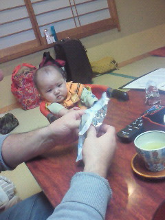 初めて離乳食を口にした京ちゃんの表情は何とも微妙な顔で笑えました☆