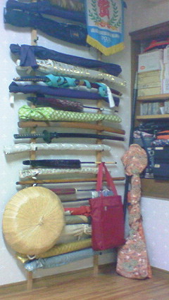 画像はお稽古場の刀や傘の踊りで使う道具たちです。