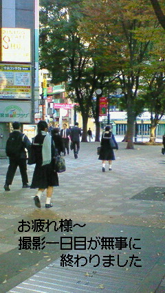 通行人の役です。携帯を打つ演技をしながら前進。フと目線を上にあげたら真っ正面にカメラ、横にはタレントさん(οдО;)えっ!??あまりに庶民オーラのタレントさんでエキストラさんと間違えて寄っていってしまいました(汗)でもめちゃ可愛かったぁ。あんなホンワカとした女性に私も生まれたかったぁ♪