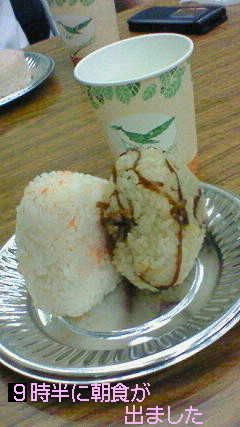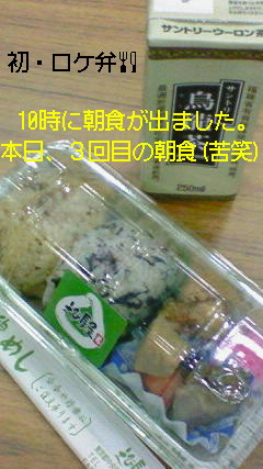 今日も朝食はおにぎりさん。一人2個。しかし、お腹が満たされない私とエキストラ友人(ドラこ)は、スタッフさんの所へゆき、おにぎりを貰っていいか聞いてみました(笑)承知をいただき、こっそりおにぎりさんをゲッチュ☆ご馳走様でしたm(__)m