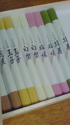 味つきそうめんを台所にて発見!しかも特に好きなピンク(梅、又は桜)と緑(茶)の麺がある~。