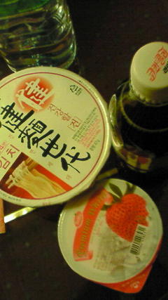 コンビニでカップラーメンと苺ゼリーを買ってきて食しました。さっきの晩ご飯、少なくてお腹がグーグーでした(´Д`)
